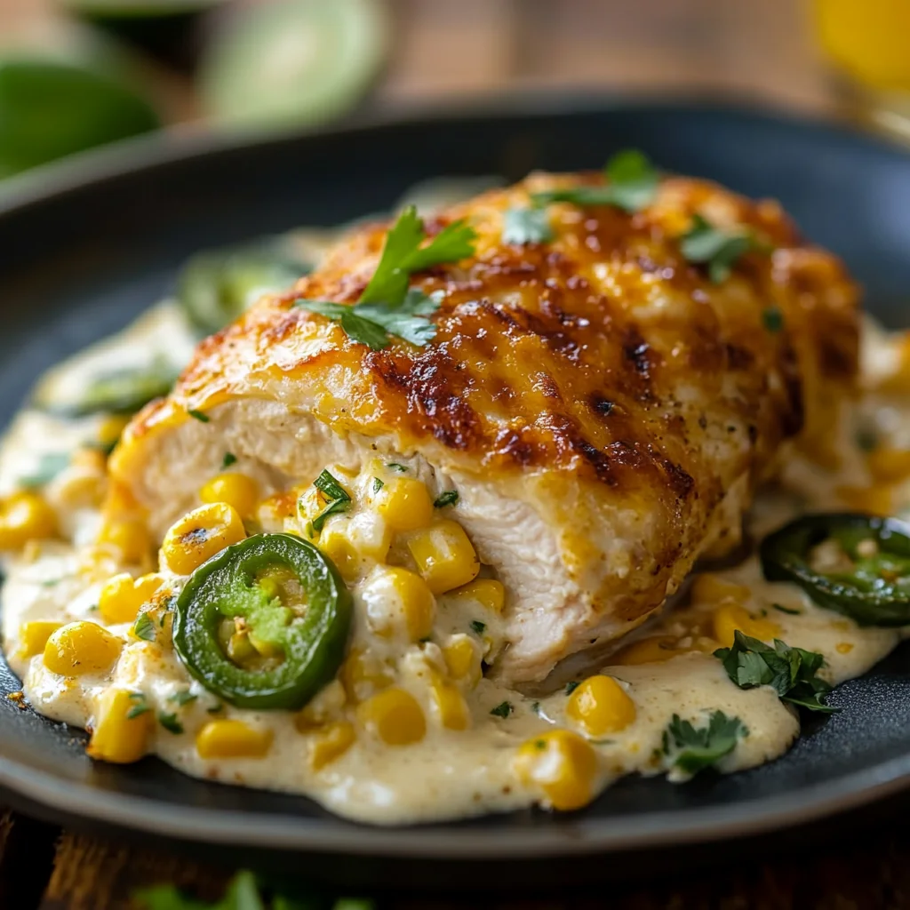 This Cheesy Jalapeno Stuffed Chicken is a delightful dish that combines the rich flavors of cheese and spicy jalapenos, served alongside creamy corn for a perfect meal.
