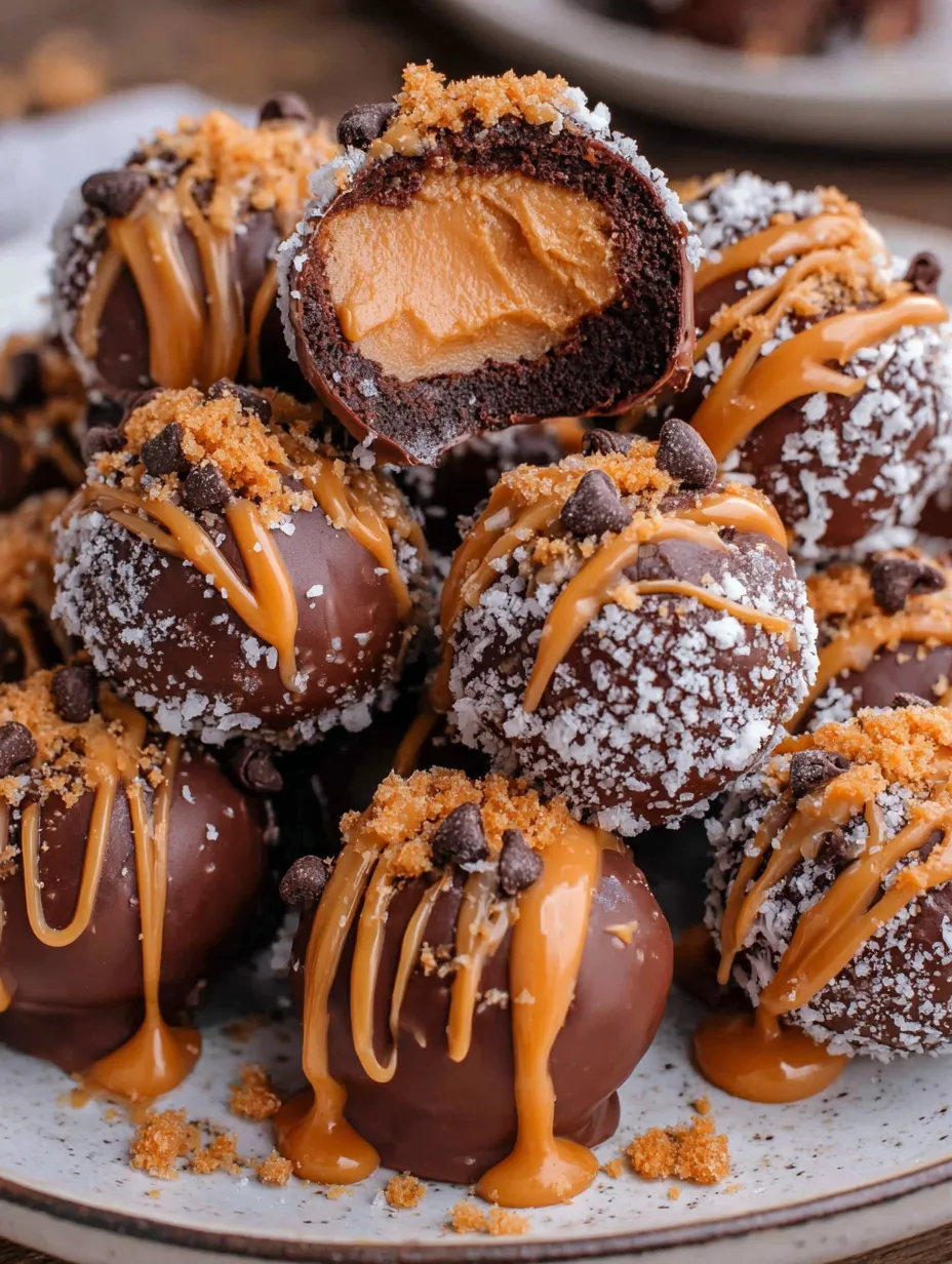 Chocolate Peanut Butter Snowballs with Caramel Drizzle