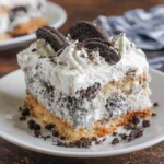 Spread the whipped cream evenly over the entire cake using an offset spatula or the back of a spoon. Cover every bit of cake—this is your canvas. Sprinkle the crushed Oreos generously over the whipped cream. Like, really generously. This is cookies and cream tres leches—the Oreos should be visible from space. Arrange whole Oreos decoratively on top. Drizzle with chocolate syrup if you’re feeling fancy.