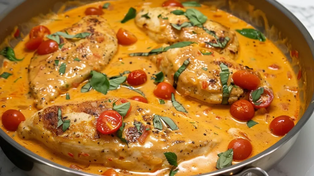 This is comfort food that thinks it’s fancy — and honestly, it kind of is. Picture juicy, perfectly seared chicken breasts swimming in the most incredible creamy tomato sauce that’s somehow both rich and bright at the same time. We’re talking cherry tomatoes that burst with sweetness, fresh herbs that make everything smell like an Italian grandmother’s kitchen, and a sauce so good you’ll want to lick the pan (and I won’t judge you if you do). This is the kind of dish that makes your family think you’ve been secretly taking cooking classes, when really you just threw some stuff in a pan and let the magic happen. It’s weeknight-easy but weekend-impressive, and it goes with literally everything.