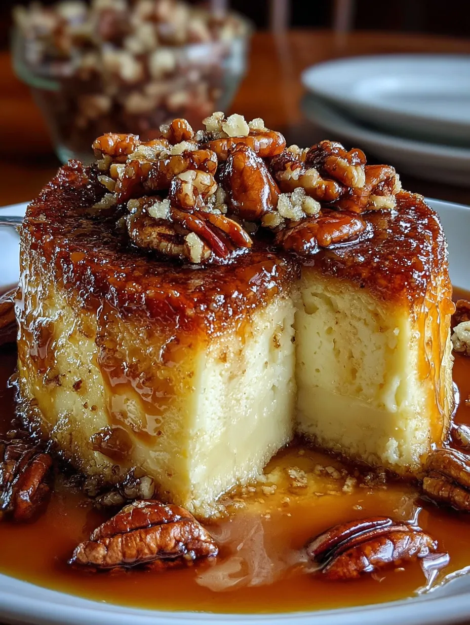 The combination works because of contrasting textures (soft cake, silky custard, crunchy sugar) and complementary flavors (buttery pecan, rich vanilla custard, bittersweet caramel, salty finish). Every component has a job to do.