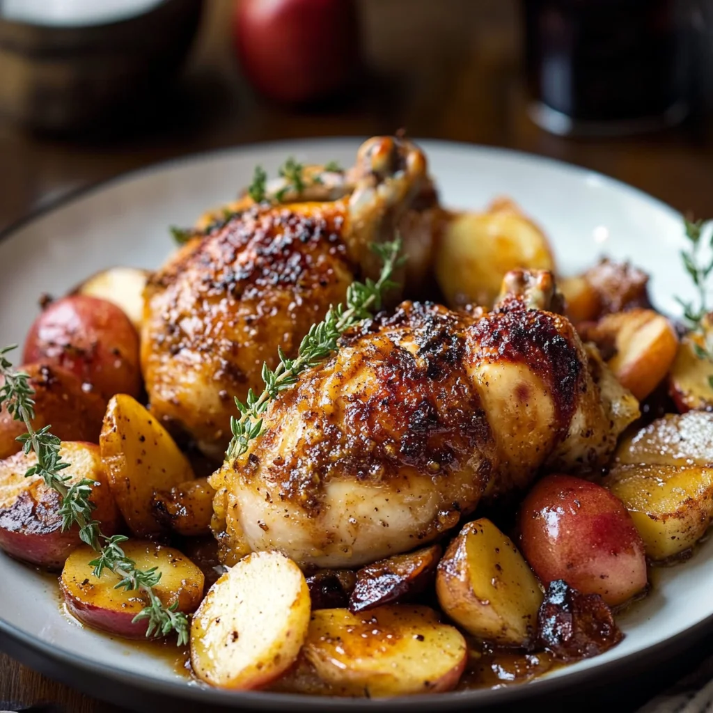 Fresh thyme provides an aromatic herbal note that pairs perfectly with both chicken and apples. You can substitute dried thyme if fresh is unavailable.