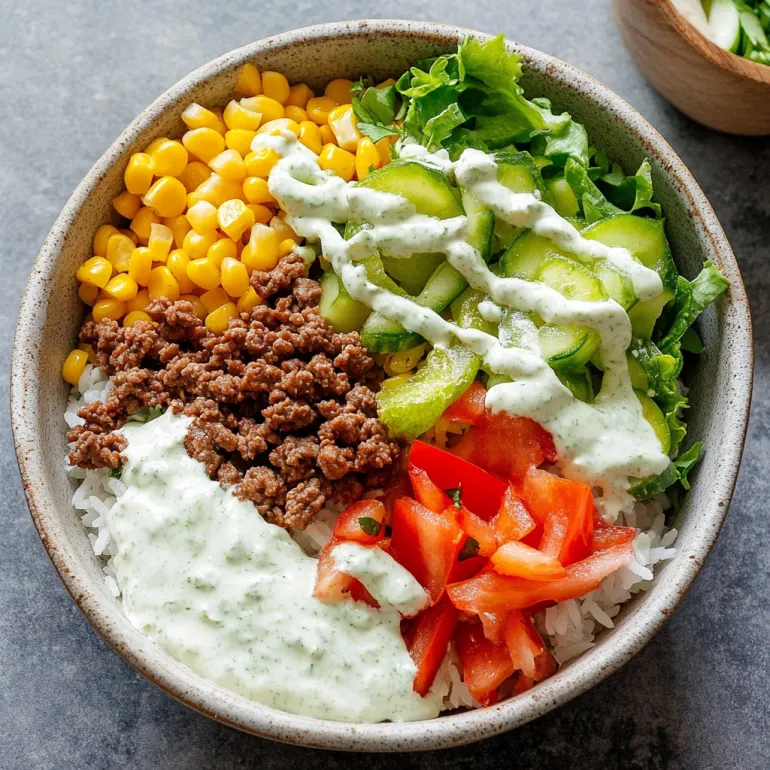 Grab a bowl and layer it up: rice first, then that juicy beef, followed by beans, corn, lettuce, tomatoes, cheese, avocado, and anything else you’re vibing with. Finish with a dollop of sour cream, a splash of hot sauce, and a squeeze of lime juice if you’re feeling zesty.