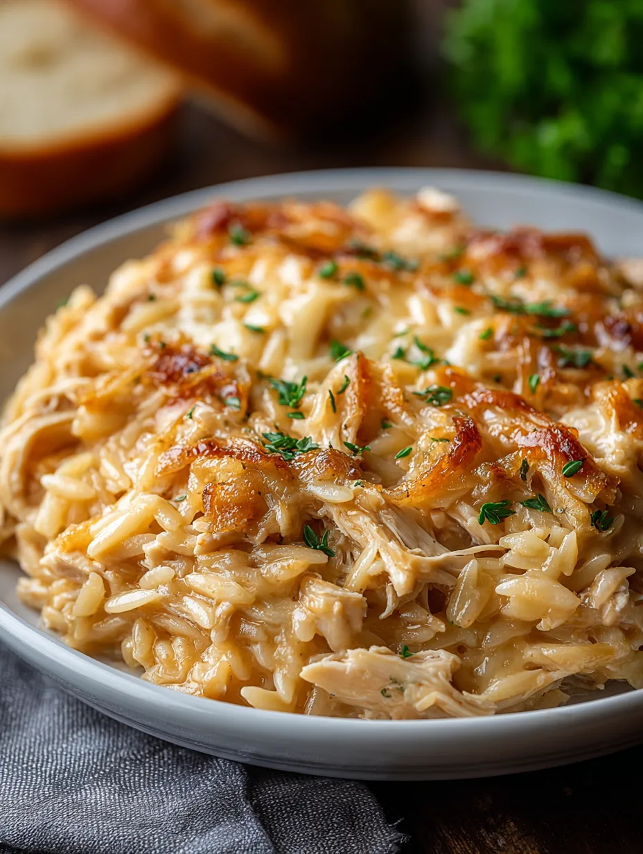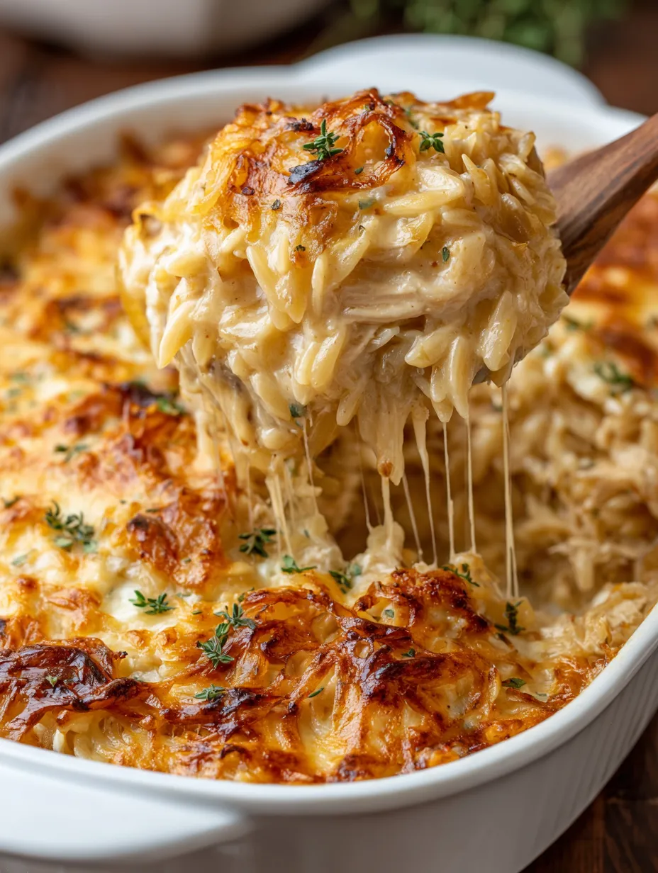 French Onion Chicken Orzo Casserole