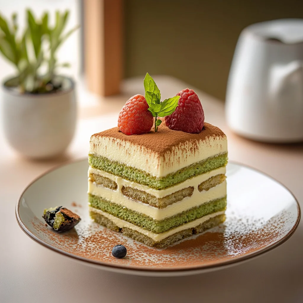Matcha Green Tea Tiramisu is a delightful twist on the classic Italian dessert that incorporates matcha green tea powder into its creamy layers. It features soaked ladyfingers layered with a rich mixture of mascarpone cheese infused with matcha flavoring, creating a unique yet familiar experience for dessert lovers.