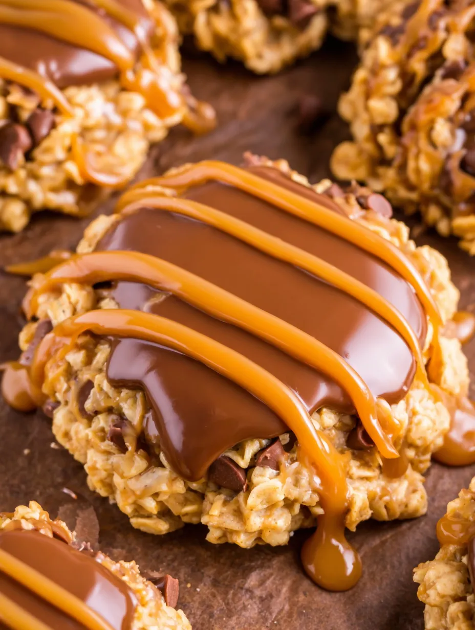 Peanut Butter Cup Version: Press a mini Reese’s cup into the center before baking, skip the caramel, just do chocolate drizzle.