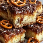 Immediately sprinkle with the reserved crushed pretzels while the chocolate and caramel are still slightly wet so they stick.