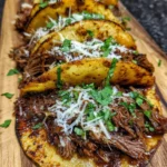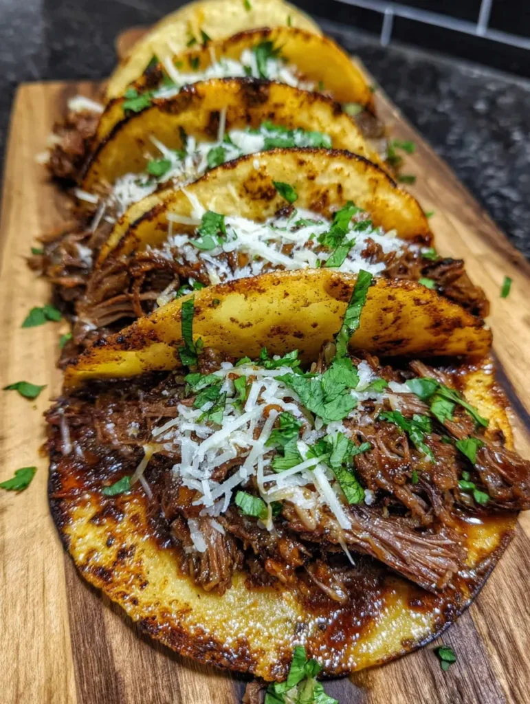 Imagine if a taco and your dreams had a baby, and that baby was raised by the world’s most patient slow cooker that turned tough beef into fork-tender, flavor-bomb shreds that are so good you’ll want to eat them straight from the pot with a spoon. That’s what we’re dealing with here. These Slow Cooker Shredded Beef Tacos are basically the holy grail of taco night—impossibly tender beef that’s been slow-cooked until it falls apart if you look at it wrong, stuffed into crispy-on-the-outside, soft-on-the-inside cheese-crusted tortillas that are so good they should probably be illegal. The beef is seasoned with smoky, spicy, savory perfection, the cheese gets all melty and creates these crispy lacy edges, and when you bite into one, you experience that perfect textural contrast that makes your brain light up like a Christmas tree. I made these for Taco Tuesday last month and my husband literally said “we’re never ordering takeout tacos again.” My teenage son, who claims to be “too cool” for family dinner, suddenly appeared like a taco-seeking missile and ate seven. SEVEN. My best friend came over, took one bite, and texted her husband “you’re on your own for dinner, I’m not leaving.” These tacos make people feral in the best possible way.