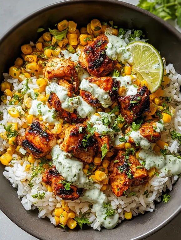 Okay, so imagine if Mexican street corn (elote) and perfectly seasoned grilled chicken had a baby on a bed of fluffy rice, then got dressed up with lime crema, fresh herbs, and all the toppings that make life worth living. That’s what we’re dealing with here. Street Corn Chicken Rice Bowl is basically juicy, spice-rubbed chicken with charred edges, sweet corn that tastes like it came from a street vendor’s cart, all piled on cilantro-lime rice and drizzled with tangy crema. You get smoky, sweet, spicy, tangy, and fresh all in one bowl. The chicken is tender and flavorful, the corn has that caramelized sweetness, and the lime crema ties everything together like edible glue. I made this for meal prep once and ate it four days in a row without getting bored. Someone saw my lunch and asked what restaurant I ordered from. Another coworker tried to trade their sad desk salad for my bowl. This recipe inspires food envy and successful meal prep.