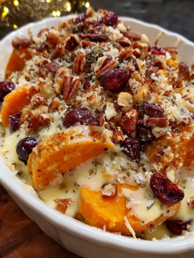 Listen, I know you came here thinking this was just another sweet potato casserole with marshmallows. WRONG. This is a legitimate, grown-up, sophistication-in-a-baking-dish gratin that happens to combine caramelized sweet potatoes, tart dried cranberries, a ridiculous amount of cream and cheese, and a crunchy pecan-breadcrumb topping that’ll make you weep with joy. We’re talking layers of thinly sliced sweet potatoes swimming in a garlicky, herb-infused cream sauce, studded with jewel-like cranberries, topped with nutty Gruyère and a buttery crumb situation that gets golden and crispy in all the right ways. This is the side dish that upstages the main course, the one that has your mother-in-law asking for the recipe, the one that makes people suddenly “too full for dessert” because they went back for seconds and thirds. I brought this to Thanksgiving once and my uncle literally proposed to it. Someone scraped the dish so thoroughly they almost took the enamel off. This gratin has MAIN CHARACTER ENERGY.