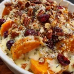 Listen, I know you came here thinking this was just another sweet potato casserole with marshmallows. WRONG. This is a legitimate, grown-up, sophistication-in-a-baking-dish gratin that happens to combine caramelized sweet potatoes, tart dried cranberries, a ridiculous amount of cream and cheese, and a crunchy pecan-breadcrumb topping that’ll make you weep with joy. We’re talking layers of thinly sliced sweet potatoes swimming in a garlicky, herb-infused cream sauce, studded with jewel-like cranberries, topped with nutty Gruyère and a buttery crumb situation that gets golden and crispy in all the right ways. This is the side dish that upstages the main course, the one that has your mother-in-law asking for the recipe, the one that makes people suddenly “too full for dessert” because they went back for seconds and thirds. I brought this to Thanksgiving once and my uncle literally proposed to it. Someone scraped the dish so thoroughly they almost took the enamel off. This gratin has MAIN CHARACTER ENERGY.