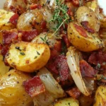 This isn’t some boring, unseasoned roasted potatoes situation. This is potatoes that have been blessed by bacon, kissed by caramelized onions, and embraced by garlic. The Yukon golds get golden and crispy from the high heat and bacon fat. The onions add sweetness. The garlic adds depth. The bacon adds… well, bacon adds everything. Together they create something that’s way more than the sum of its parts.